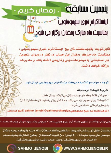 قابل توجه بازديدكنندگان پيج اينستاگرام خبري سهموجنوبي ، بمناسبت ماه مبارك رمضان اين حساب در نظر دارد براي پنجمین بار مسابقاتی با موضوعات ديني و تاريخي داشته باشد و سه برنده روزانه خواهد داشت.