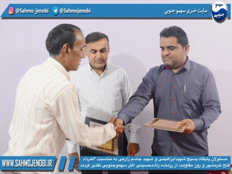 مسئولان پايگاه بسيج شهيدابراهيمى سهموشمالى و پايگاه بسيج شهيدجاسم زارعى سهموجنوبى به مناسبت ٣خرداد فتح خرمشهر و روز مقاومت با حضور در منزل رزمنده راشدحسينى اهل سهموجنوبى از آن قدرداني كردند.