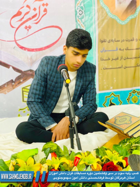 فرهاد حسنی دانشآموز دبیرستان شهیدهمت کوشکنار و اهل روستای سهموجنوبی موفق به كسب رتبه سوم رشته حفظ پنج جزء سی وهشتمین دوره مسابقات قران کریم دانش آموزان استان هرمزگان شد